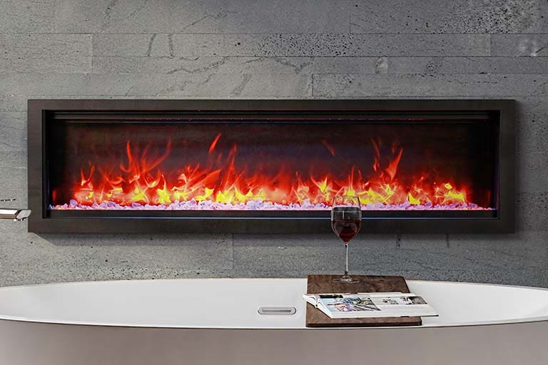 At just 5-1/2 inches in depth, the Ambiance® Impressionist® indoor-Outdoor smart electric fireplace series is the premier choice for new construction projects and renovations alike. It is giving you the ability to install your fireplace with your choice of finishing material built right to the glass for – true clean-face inches design or using the provided black metal surround trim. Your choice, your design! Create your custom ambiance by adjusting the flame, ember bed and mood colors to your taste with the included remote control or with your smart phone. You can now impress your family and friends with the nicest electric fireplaces on the market to date!